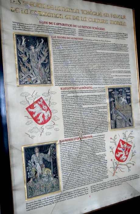 Tablo ke sjezdu pro mravní výchovu v Ženevě v r. 1921, s francouzským textem o smyslu českých dějin od Jana Herbena (s ilustracemi Františka Kysely), které kulka zasáhla symbolicky ve slově LIBÉRATION (osvobození).