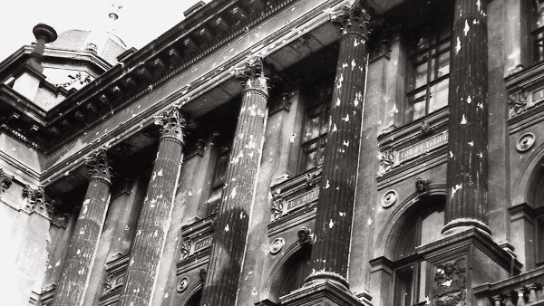 Detail střelami poničeného sousoší Géniů z průčelí budovy